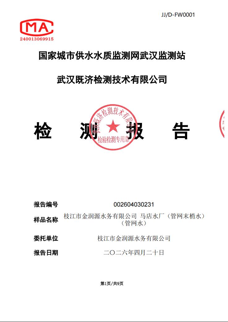 2026年4月马店水厂管网末梢水水质检测公告
