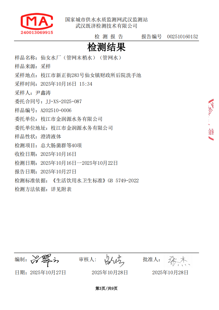 2025年10月仙女水厂二次供水末梢水水质检测公告