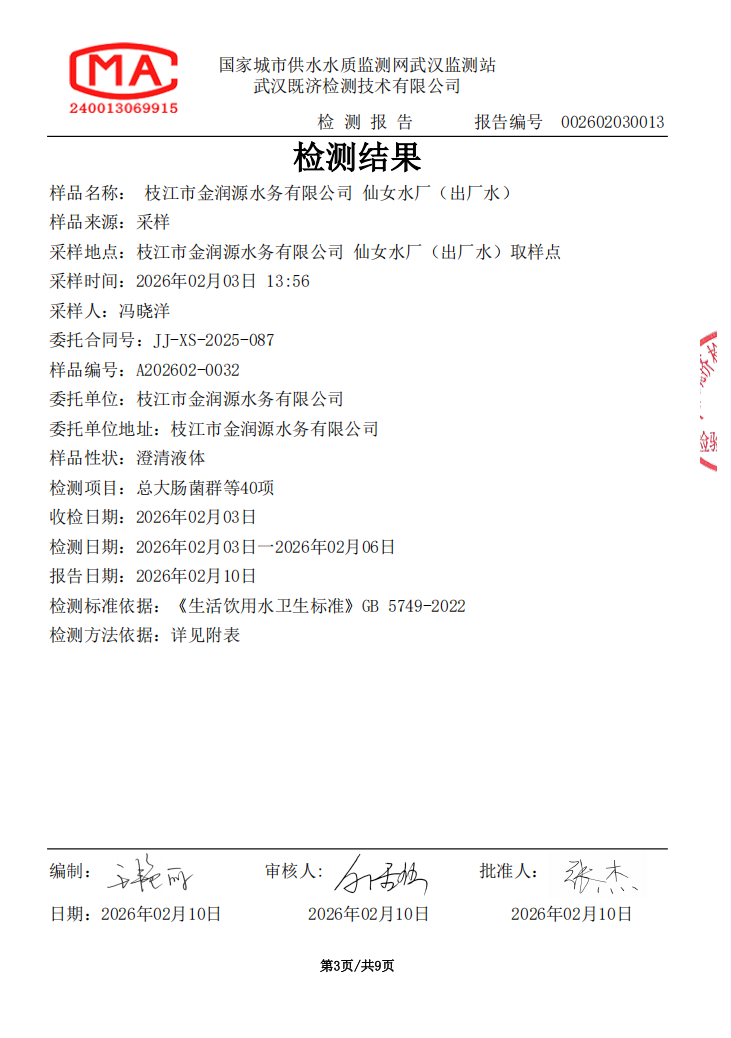 2026年2月仙女水厂出厂水水质检测公告