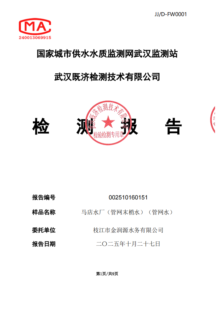 2025年10月马店水厂二次供水末梢水水质检测公告