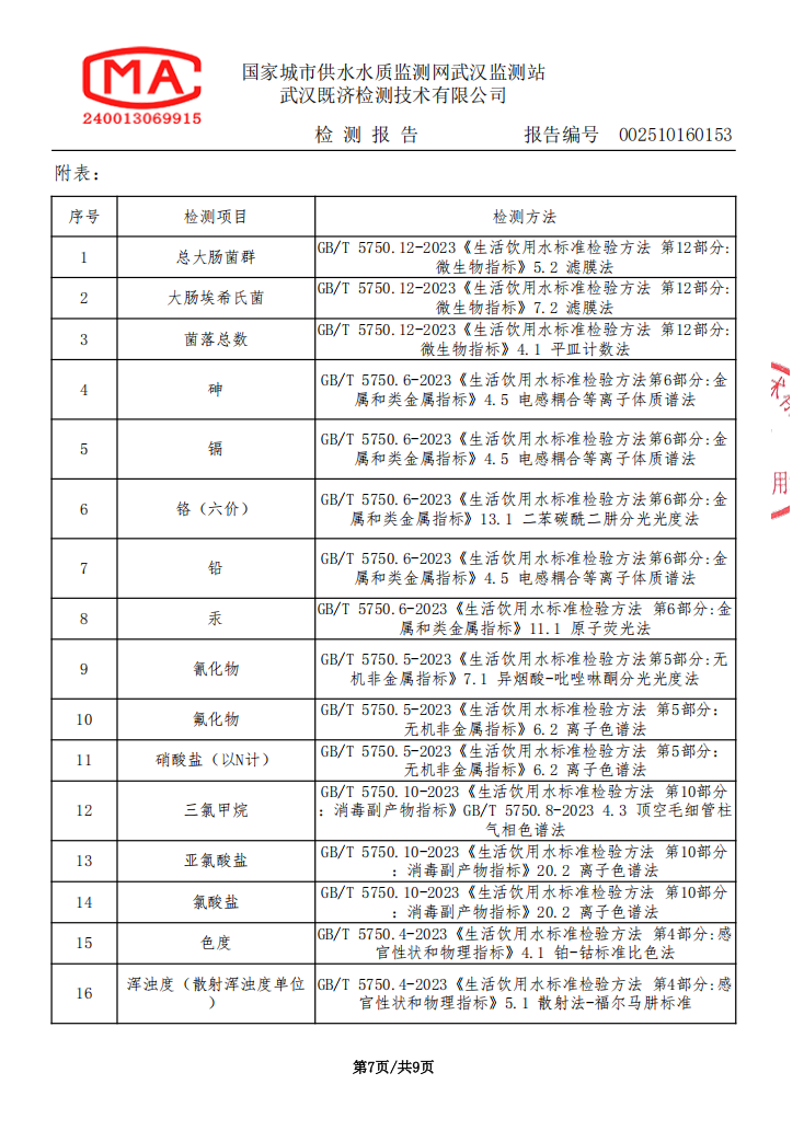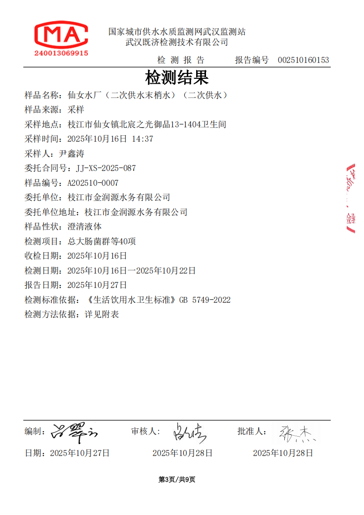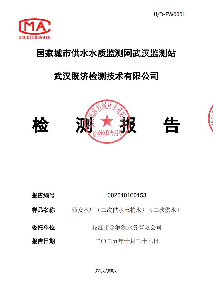 2025年10月仙女水厂二次供水末梢水水质检测公告