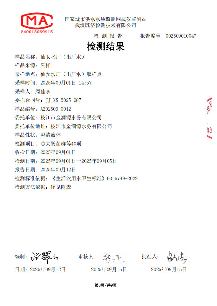 2025年9月仙女水厂出厂水