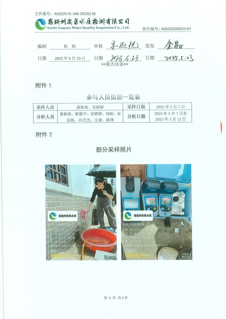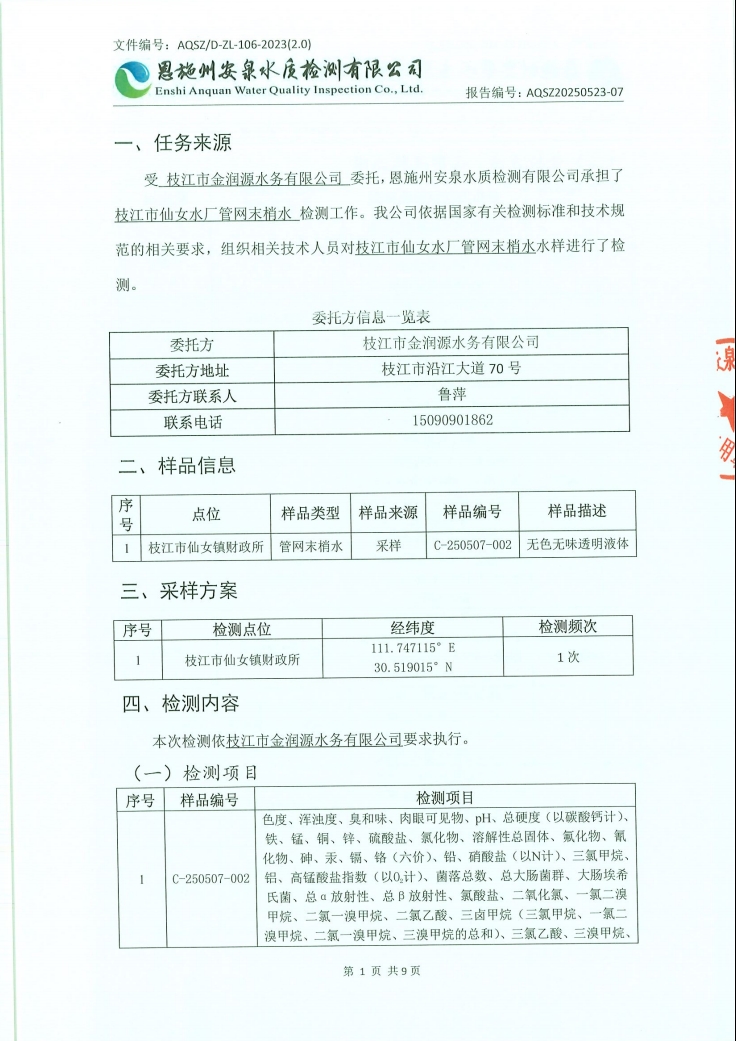 2025年5月仙女水厂管网末梢水水质检测公告