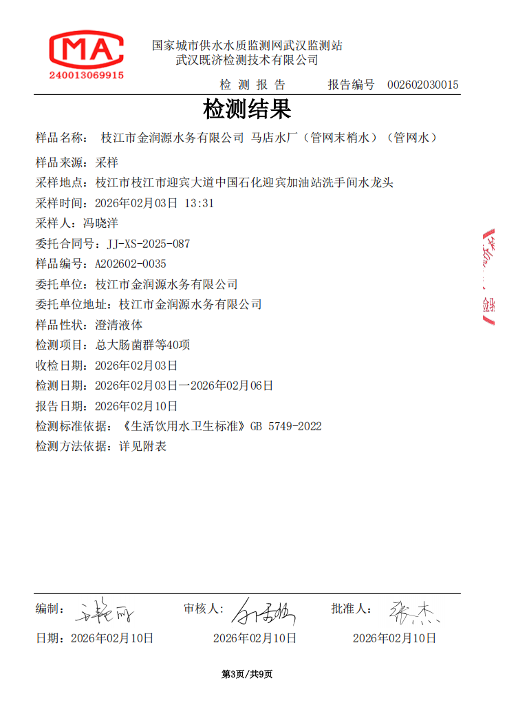 2026年2月马店水厂管网末梢水水质检测公告