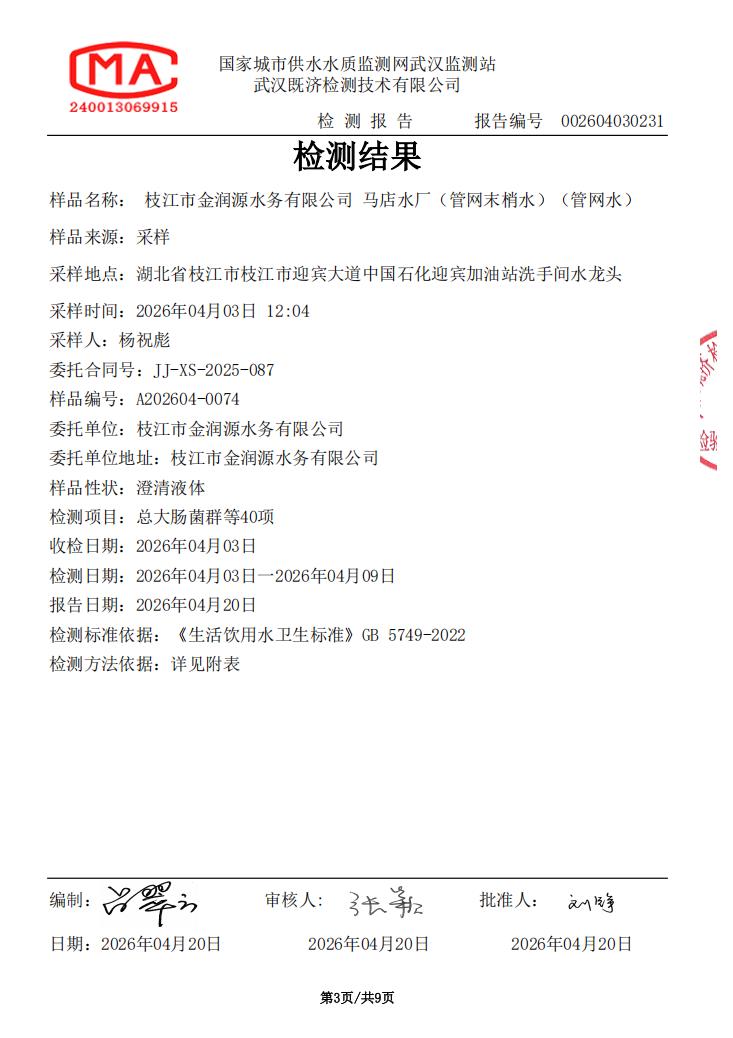 2026年4月马店水厂管网末梢水水质检测公告