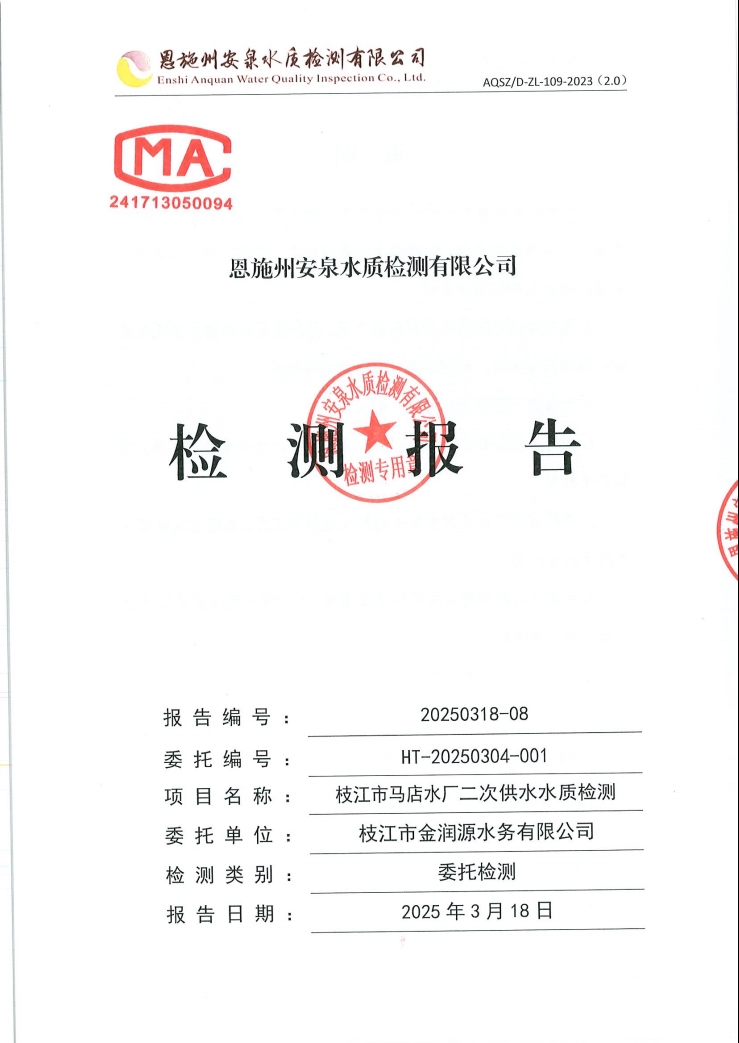 2025年3月马店水厂二次供水末梢水水质检测公告