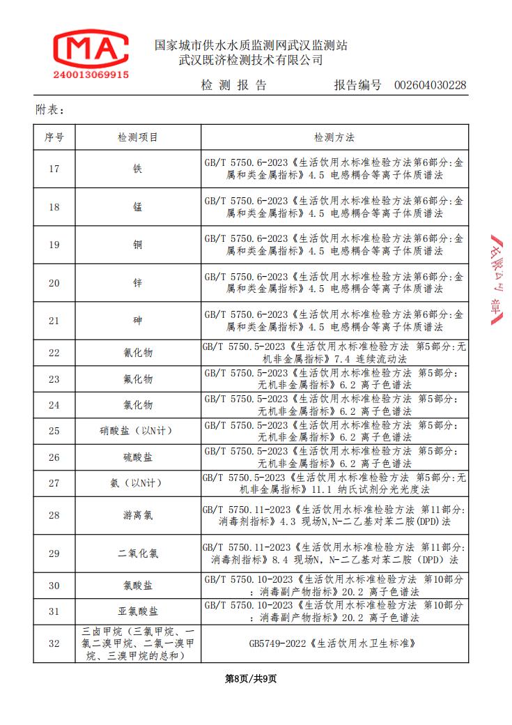 2026年4月仙女水厂出厂水