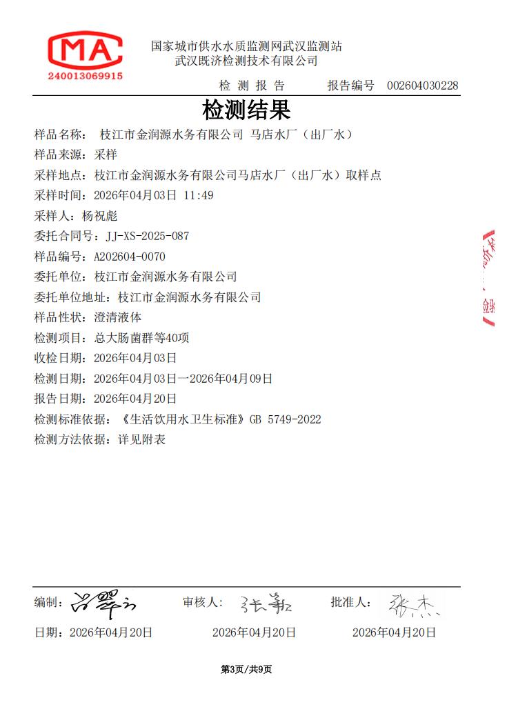 2026年4月马店水厂出厂水水质检测公告