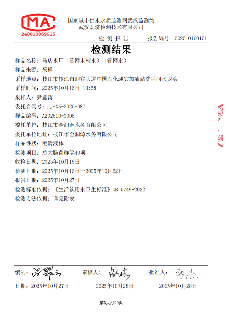 2025年10月马店水厂二次供水末梢水水质检测公告